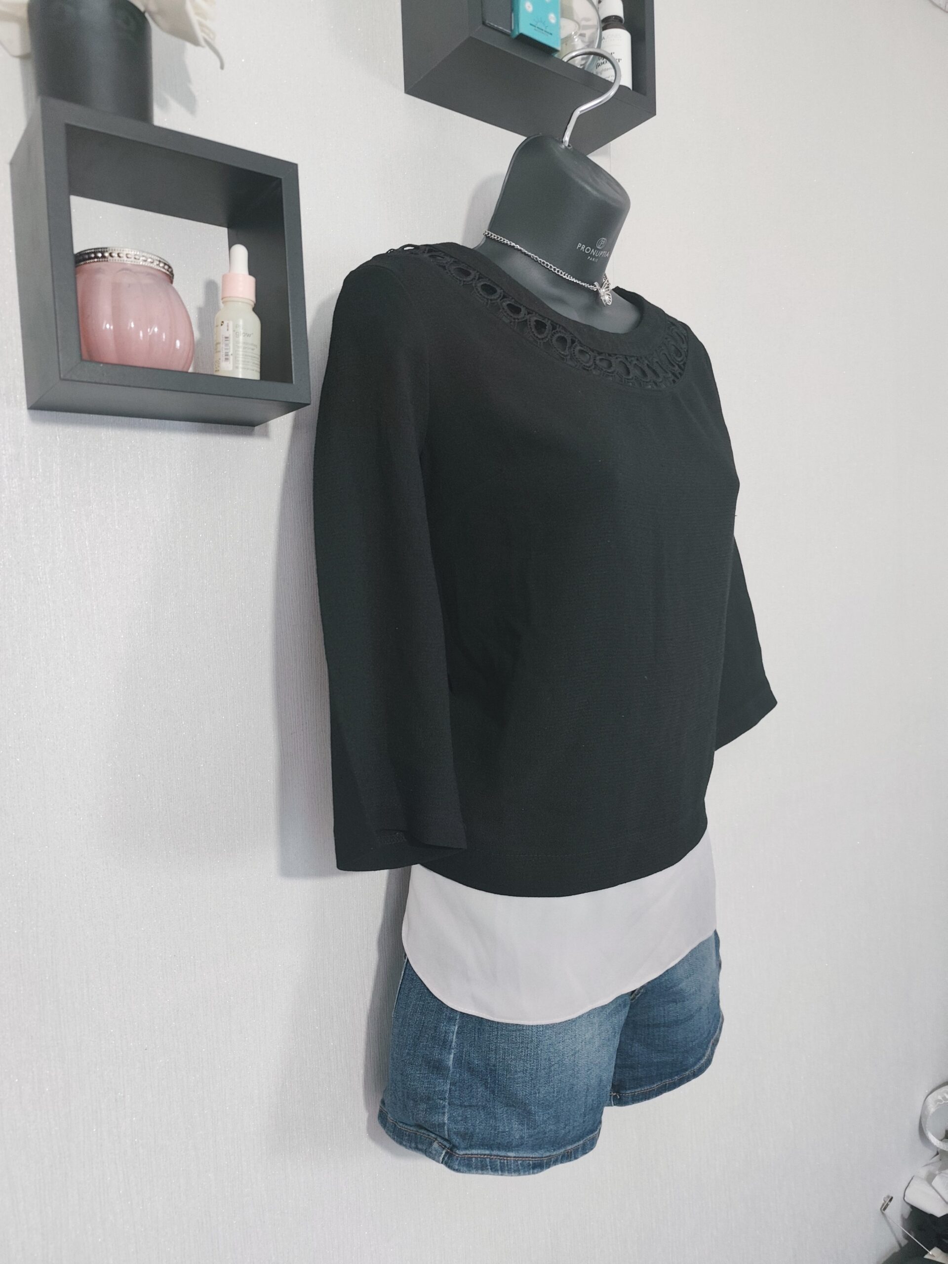 Craquez pour ce joli top combiné noir et blanc ! Il vous donnera l’impression d’un look superposé ultra stylé sans effort. Le col rond avec ses petits détails ajourés est juste canon 😍.
