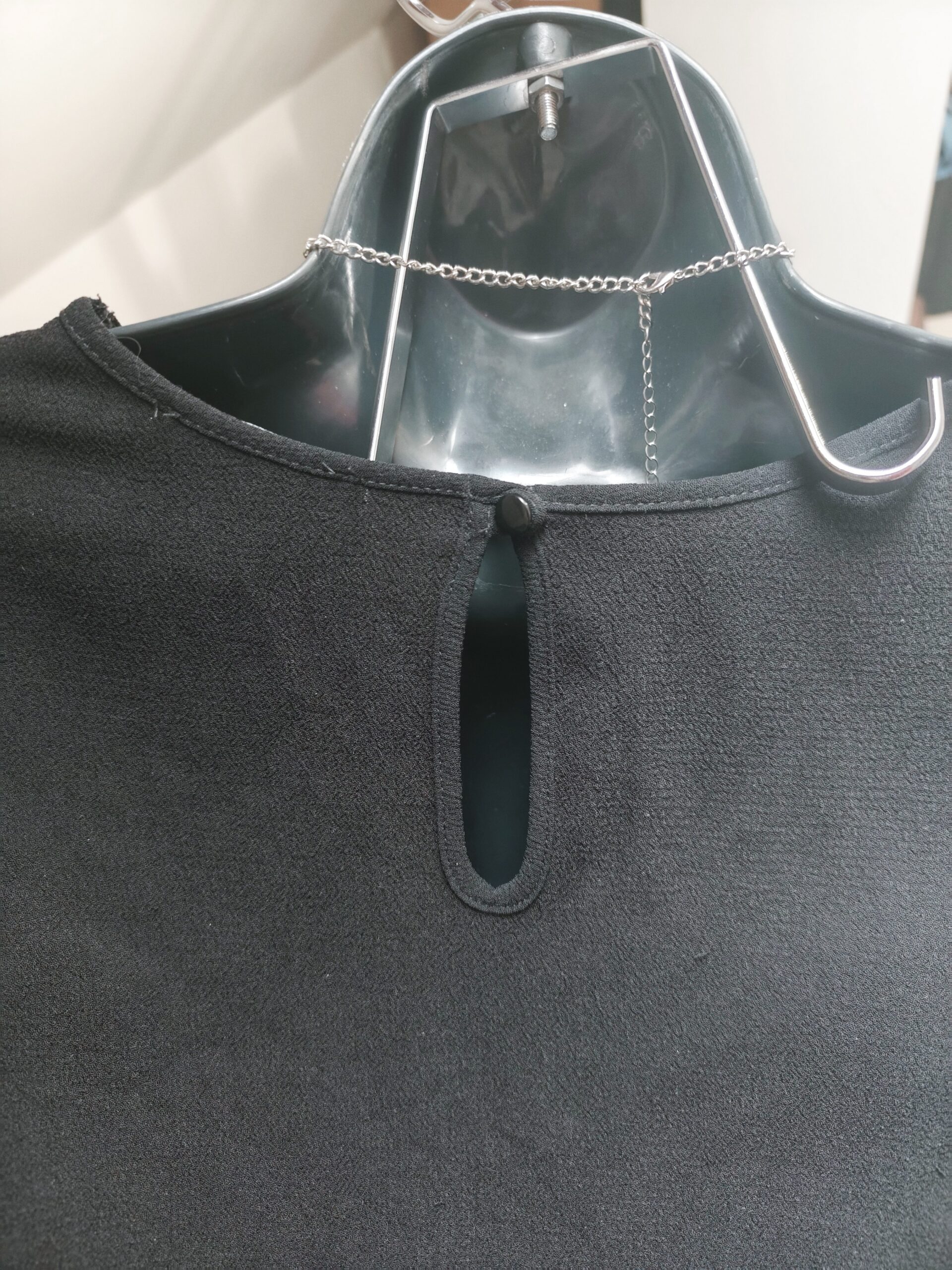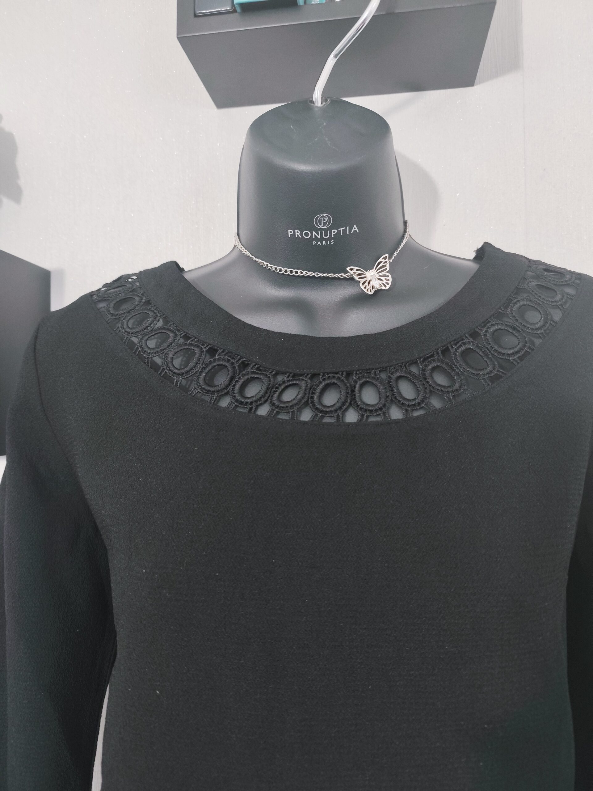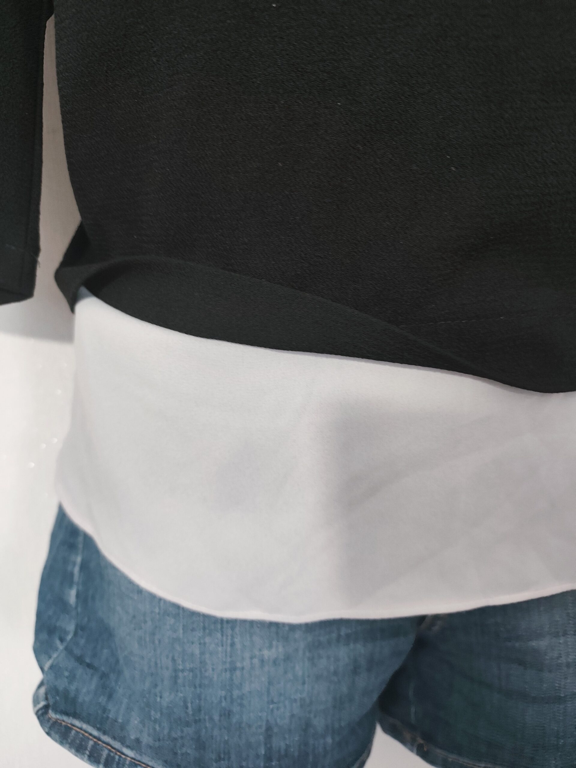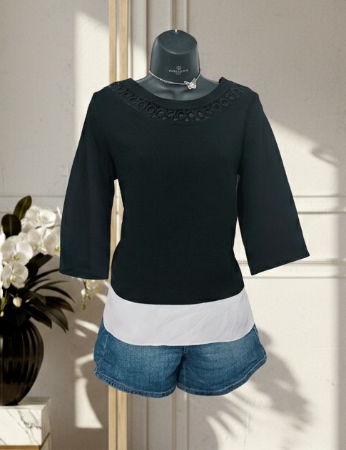 Blouse combiné noire avec fausse chemise blanche sur le bas. Col rond à trous manches 3/4