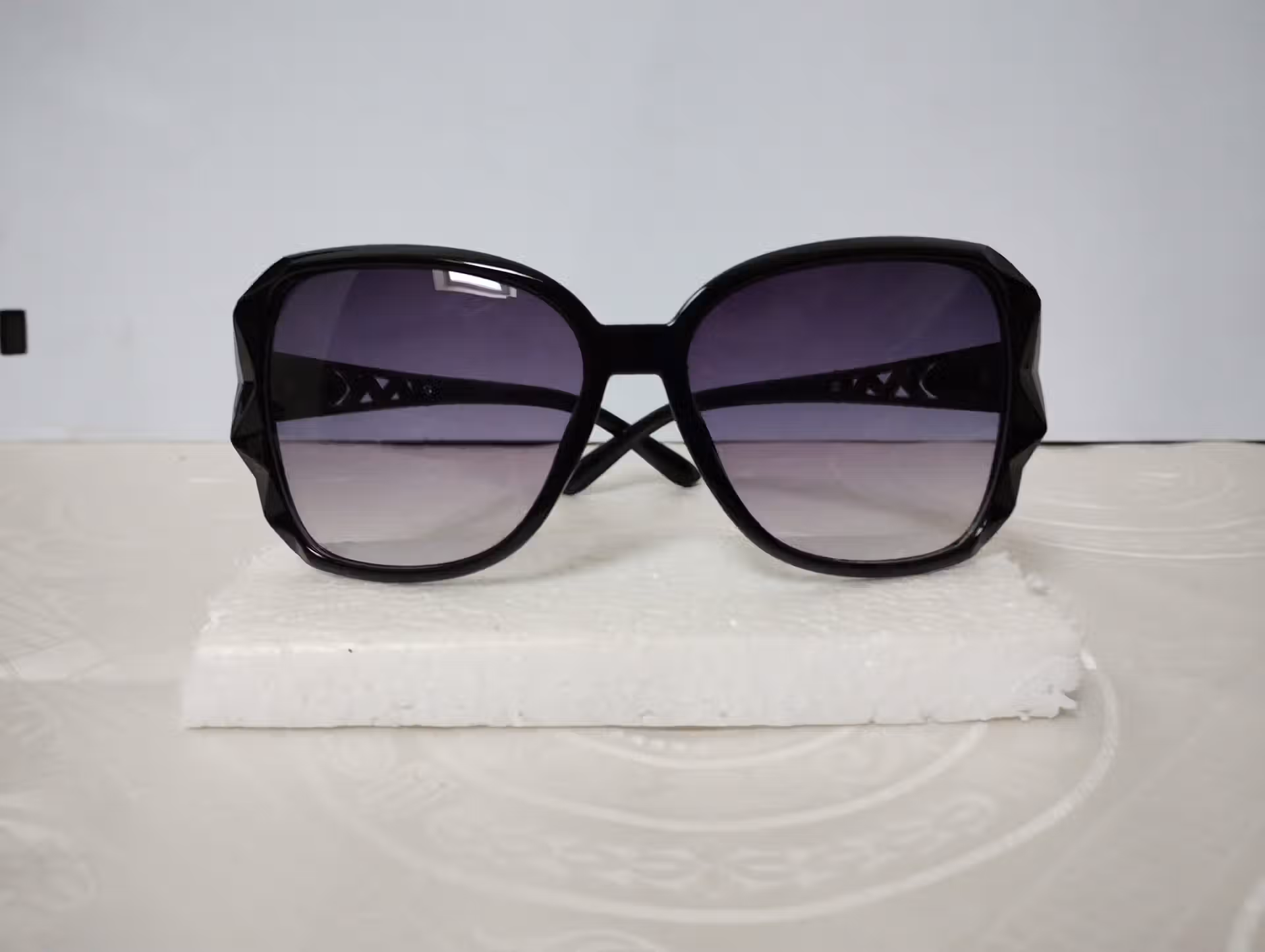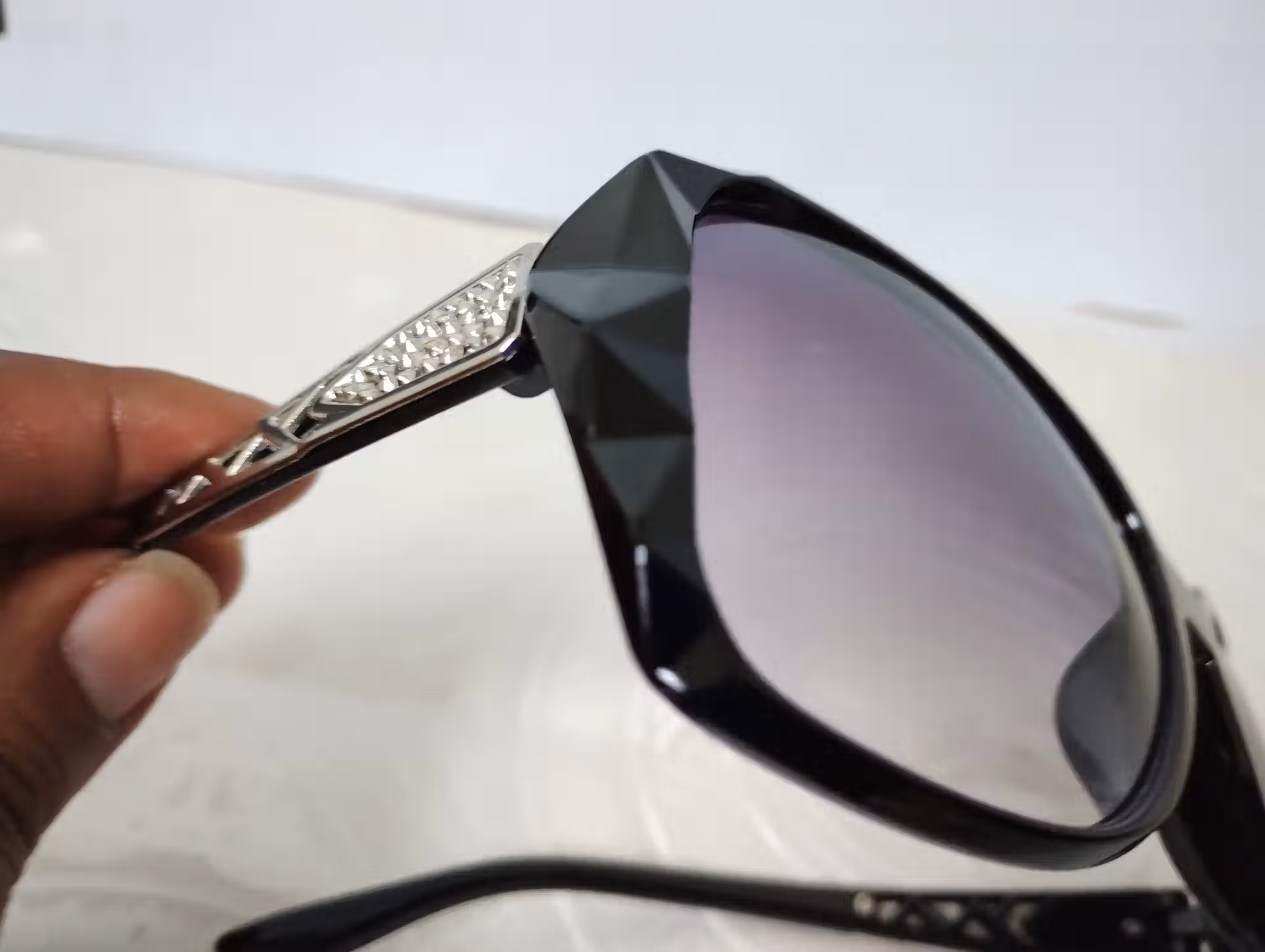 Lunettes de soleil haut de gamme au design élégant et intemporel. Formes oeil de chat avec monture noire en 3D. Branches métal argentés avec motifs. Verres dégradés légèrement violacées.