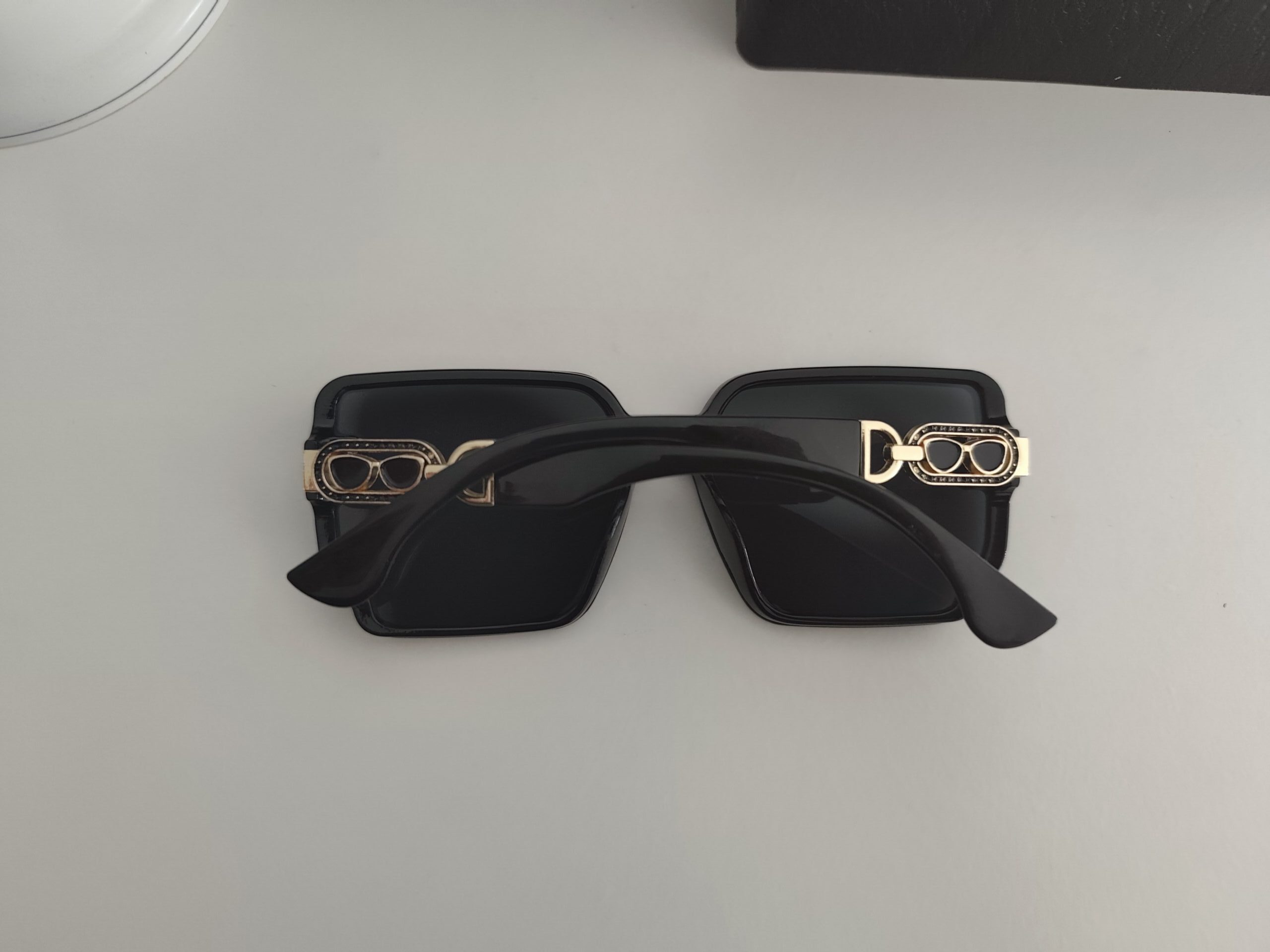 Lunettes de soleil tendance au design oversize carré, style luxe inspiration haute couture. Le détail signature : une charnière dorée ornée d’un motif lunettes miniature serti de strass qui apporte une touche glamour et premium ultra reconnaissable.