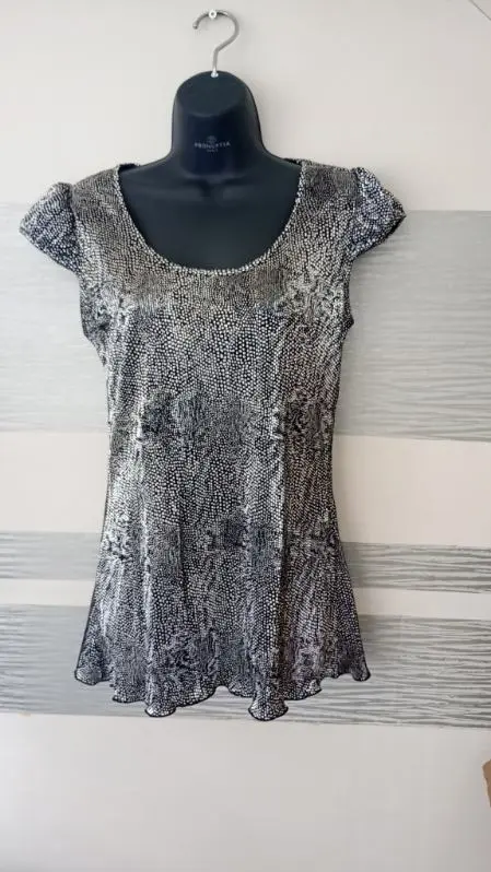 Top long et ample, rayures argentées, épaules bouffantes, élastique.
