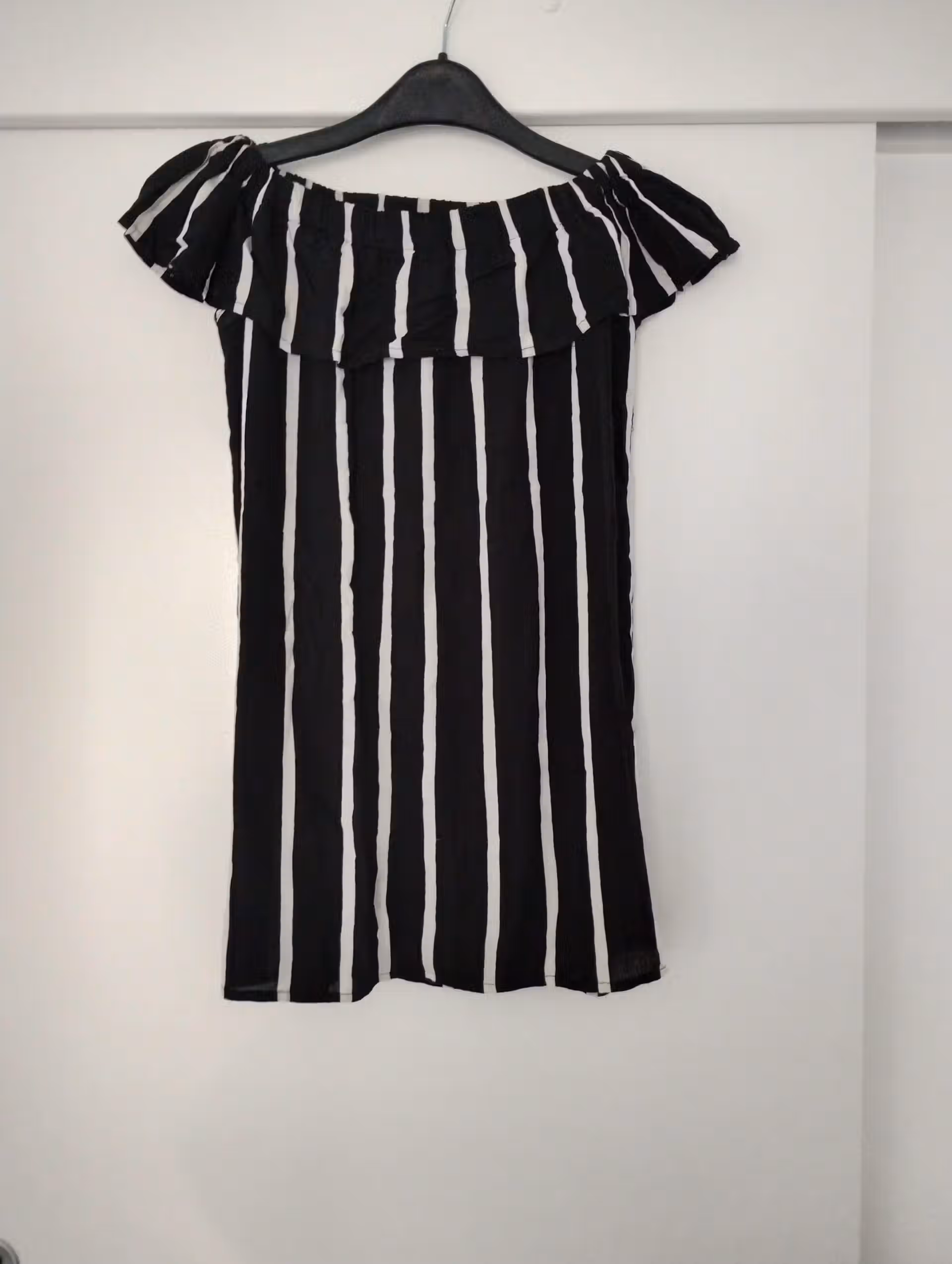 Élégant, Top d’été noir avec rayures blanches, col bardot à volant, sans manche. Peut se porter épaules dénudées ou épaules cachés pour un col large arrondi.