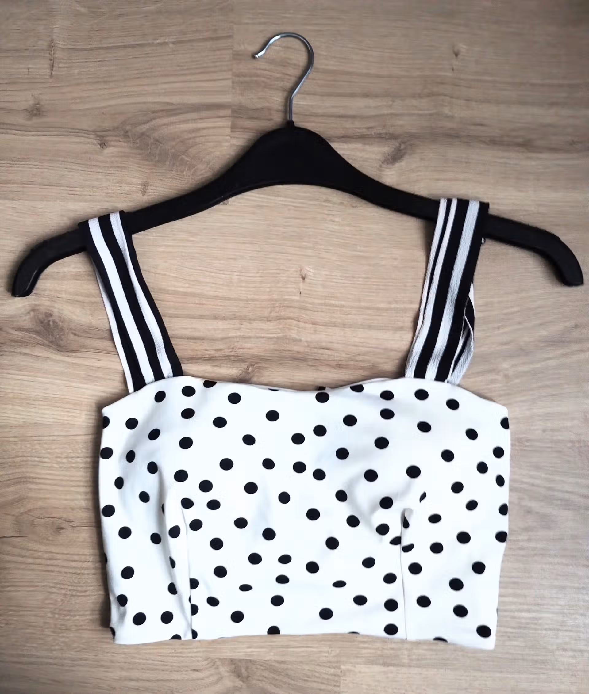 Hyper sexy avec son motif à points noirs. Bretelles réajustables bicolore noir et blanc qui referme le vêtement à l’arrière avec un noeud. A l’intérieur, coussinets sur la poitrine